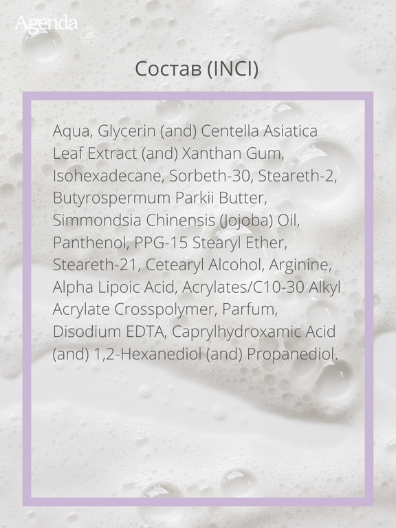 Aqua, Glycerin (and) Centella Asiatica Leaf Extract (and) Xanthan Gum, Isohexadecane, Sorbeth-30, Steareth-2, Butyrospermum Parkii Butter, Simmondsia Chinensis (Jojoba) Oil, Panthenol, PPG-15 Stearyl Ether, Steareth-21, Cetearyl Alcohol, Arginine, Alpha Lipoic Acid, Acrylates/C10-30 Alkyl Acrylate Crosspolymer, Parfum, Disodium EDTA, Caprylhydroxamic Acid (and) 1,2-Hexanediol (and) Propanediol.