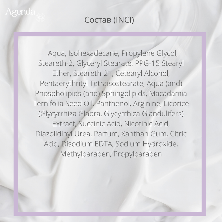 Aqua, Isohexadecane, Propylene Glycol, Steareth-2, Glyceryl Stearate, PPG-15 Stearyl Ether, Steareth-21, Cetearyl Alcohol, Pentaerythrityl Tetraisostearate, Aqua (and) Phospholipids (and) Sphingolipids, Macadamia Ternifolia Seed Oil, Panthenol, Arginine, Licorice (Glycyrrhiza Glabra, Glycyrrhiza Glandulifers) Extract, Succinic Acid, Diazolidinyl Urea, Parfum, Xanthan Gum, Disodium EDTA, Methylparaben, Propylparaben.